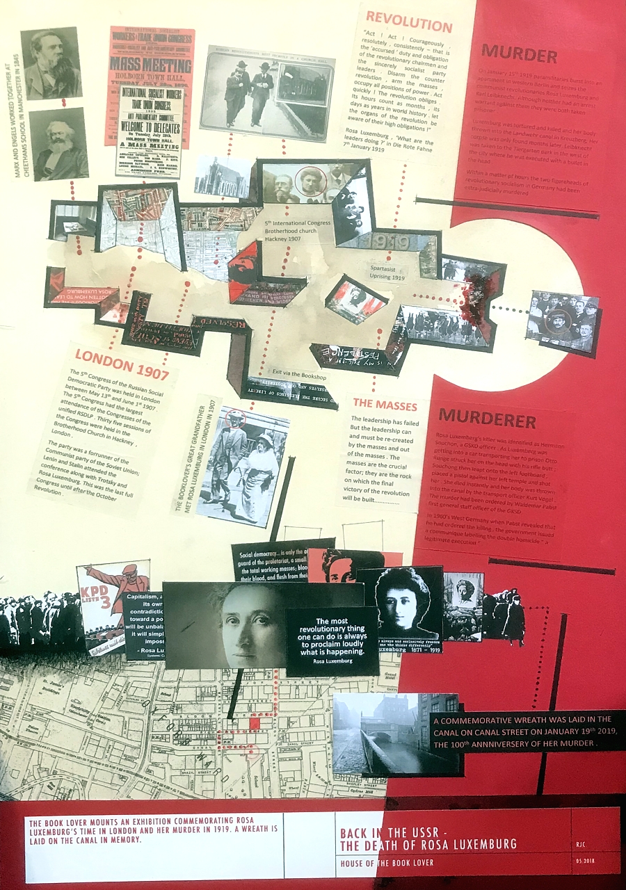 The Book Lover mounts an exhibition commemorating Rosa Luxemburg's time in London and her murder in 1919. A wreath is laid on the canal in memory.