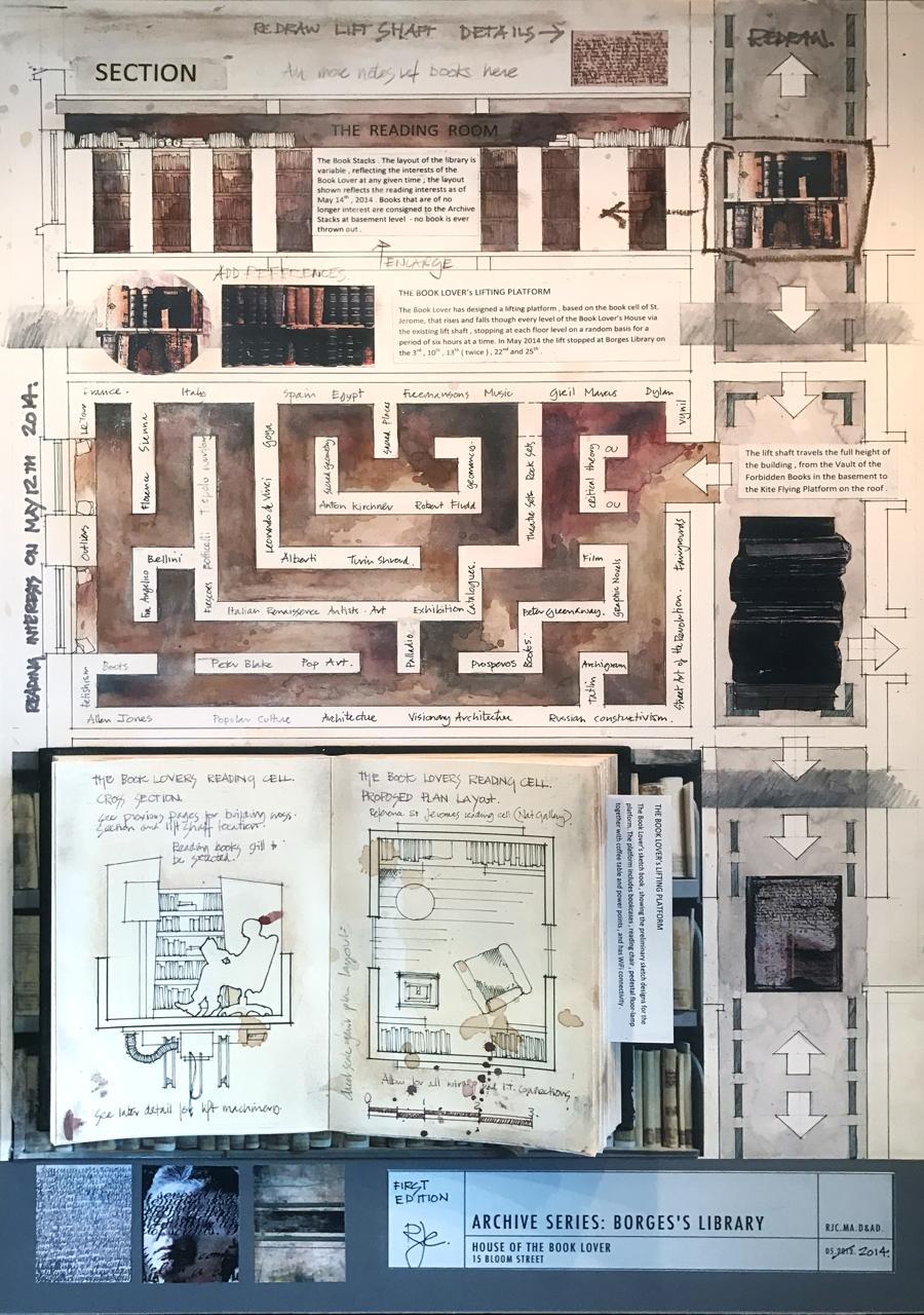 Borges Library and the Lifting Platform – a guide as to what the interests were of our Book Lover on a given day, and a guide to the Lifting Platform by which he gains access to all the floors.