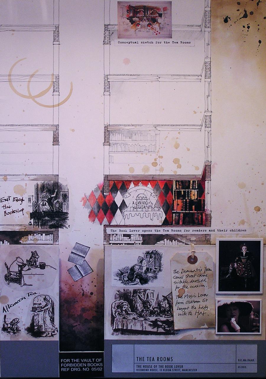 Early ideas for the layout of the book stalls, together with the Book Lover’s sketch book where he sketches out his ideas for the Lifting Platform, designed and built by RCA Interiors of Manchester.